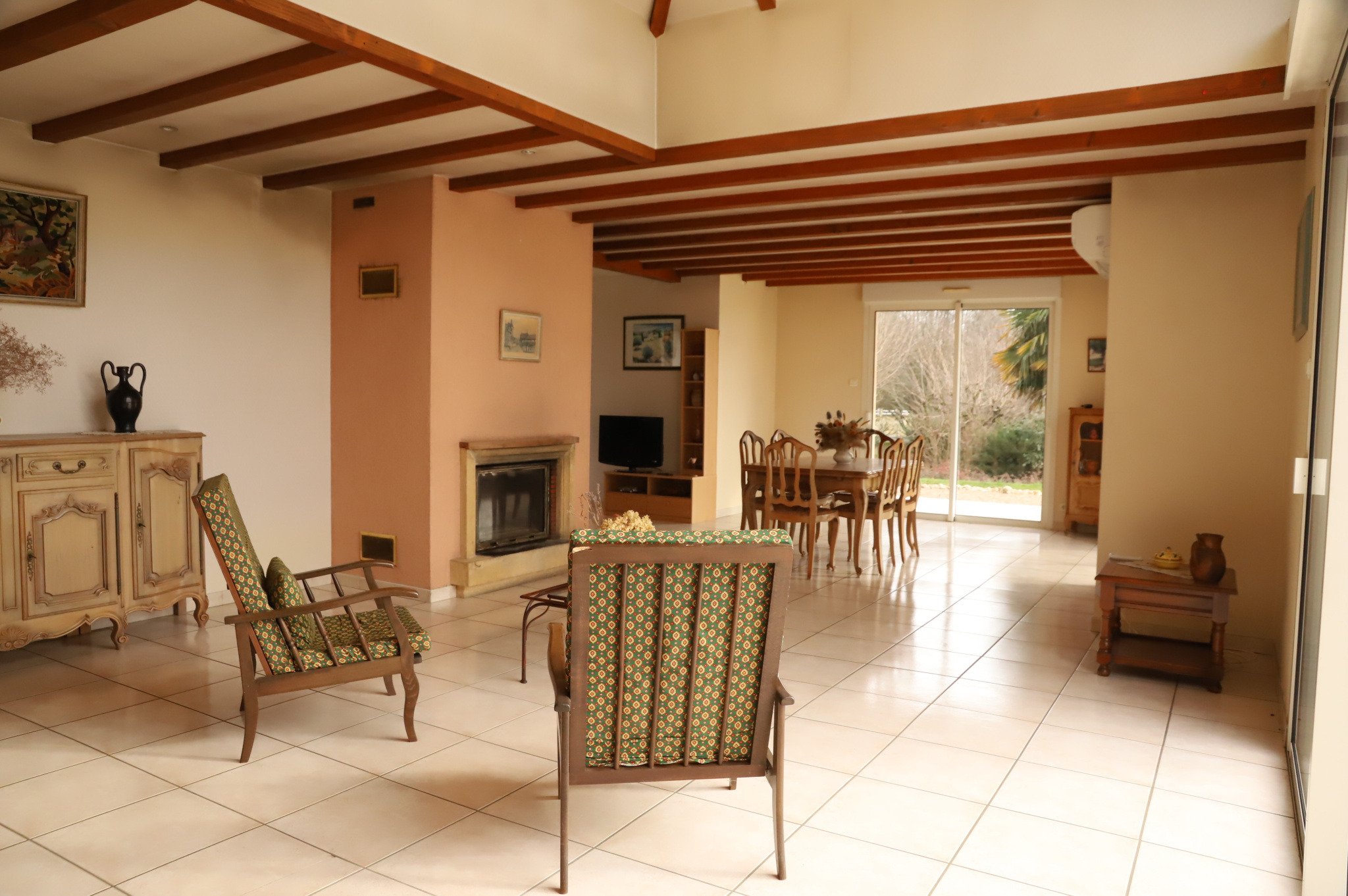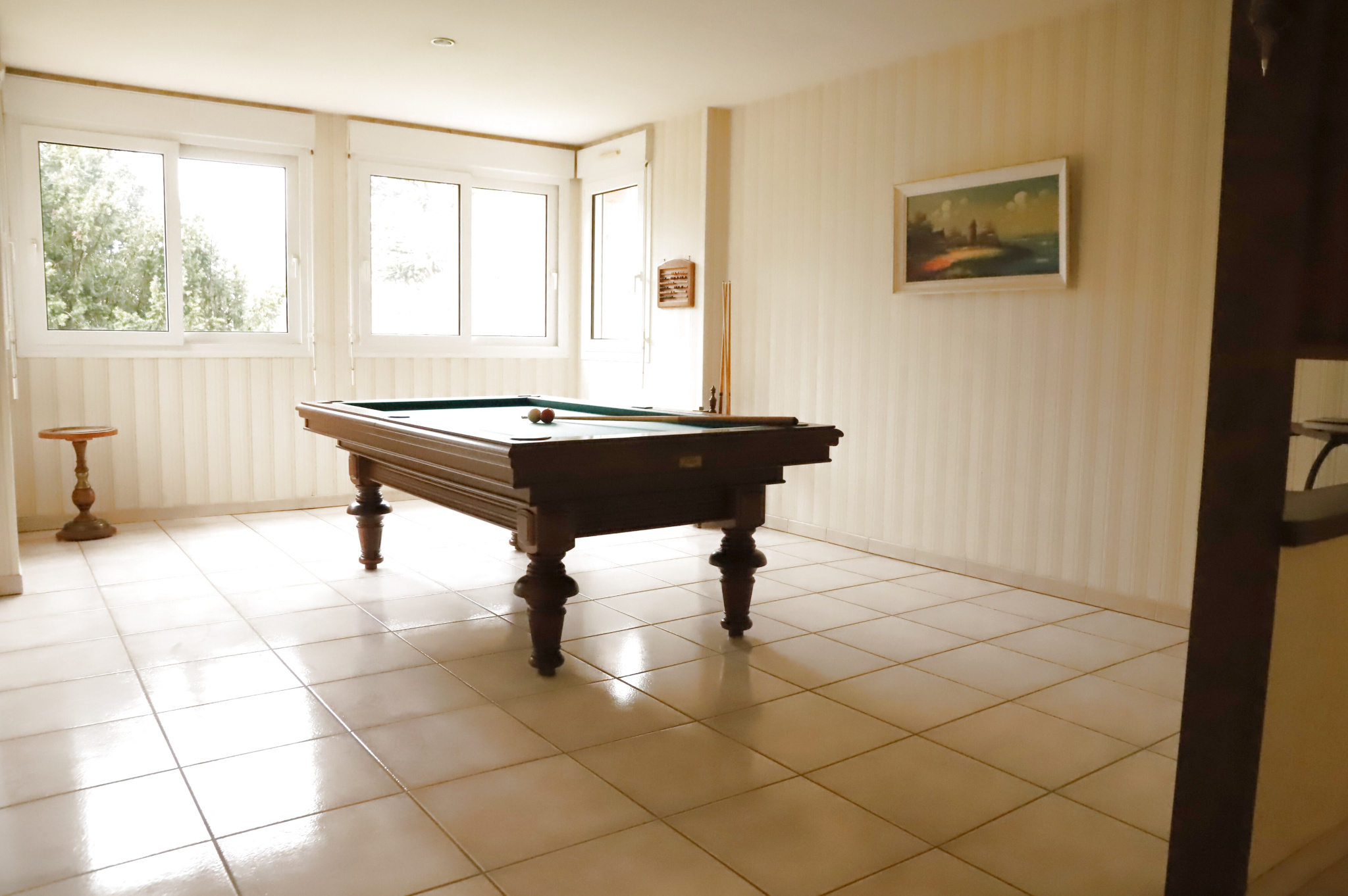 Une vaste entrée de plus de 12m², avec placards, permet d'accéder à l'immense séjour/salle à manger (57 m²) et ses grandes baies vitrées exposées Sud-Ouest donnant sur une terrasse carrelée de plus de 80m². Contiguë à l'entrée, une belle salle de jeux semi-ouverte abrite un beau billard (non vendu).